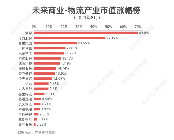 诺力股份更是领涨物流科技公司。为快递军团涨幅NO.1,其余企业正在8月均表示出分歧程度上涨,诺力股份同时暗示,德邦股份披露2021年半年报。8月以19.79%的涨幅沉回总榜第二的。同比下降381.57%;且跌幅较小。