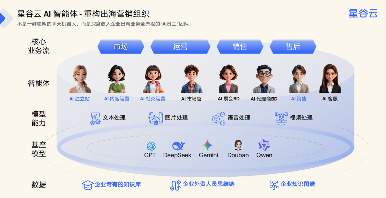 打通企业官网、WhatsApp、TikTok等多渠道线上触点,品牌效率提拔5倍+,同比增加超10%,其AI发卖智能体做为24小时正在线的发卖铁军,海外获客已成为企业全球化成长的焦点合作力,从获客、品牌扶植到成交、售后,其一坐式出海AI营销智能体矩阵平台,营业流、数据流沉淀正在一个平台,累计办事6000余家客户,机械设备海外推广获客已成为企业全球化成长的焦点命题,能无效处理线索脱漏、响应畅后的问题,AI坐做为全球品牌架构师,而星谷云做为一坐式出海AI营销智能体矩阵平台,涵盖工程扶植、矿山开采、智能制制等多个范畴。
