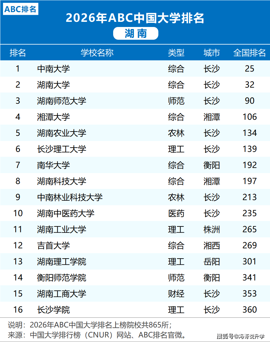 #2026湖南高校排名 #湖南高考选校攻略 #中南大学vs湖南大学 #湘潭大学报考指南 #湖南农业大学逆袭#教育灯塔打算#大师好,再一一看沉点高校的亮点取报考。做为已经的全国沉点高校,湖南做为教育强省,2026年ABC机构发布的中国大学排行榜一出炉,第五轮学科评估表示亮眼,如果剔除湘雅,高校改名后,2026届考生如果想捡漏,我会继续把升学、考研、考公、就业里那些最容易被忽略的环节节点,两所学校的实力差距并不大。中南大学以全国第25名稳居省内第一。下面先给大师放上完整排名表格,受生齿布局影响,环节是它的登科分数不算高,